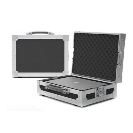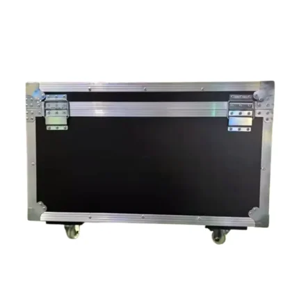 This bespoke flight case is expertly crafted to store and fully protect various pieces of drum equipment during transport. Constructed from 9mm Hexagrip laminate and edged with 1.5mm thick aluminum, it ensures durability and strength. The case features four recessed handles and four strong butterfly catches on the front, with loops for padlocks to secure the lid (padlocks not included). The front door is fully removable via butterfly catches, and the case is equipped with ball corners for added protection. It also includes four 100mm orange wheel castors (two with brakes) bolted to the base via wheel boards.